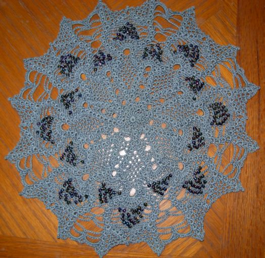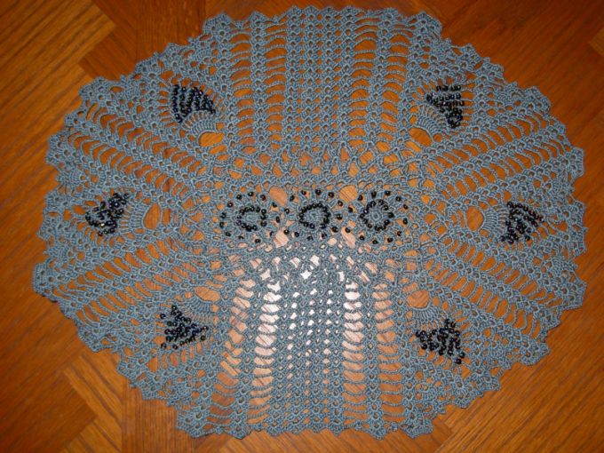 After I completed the three "Shimmering Pineapple" doilies, I still had some of the pretty beads left, but it didn't appear there were enough for a fourth doily. One doily uses 288 beads and I had 240 left. I really liked the beads, so I wanted to figure out a way to put them to good use. I decided to see if I had a non-beaded doily pattern in which I could incorporate exactly 240 beads. Using my math skills, I figured out a way to do that on a pattern called "Welcoming Oval", and this is the result! I also plan to keep this one but am likewise not sure yet just where to display it.