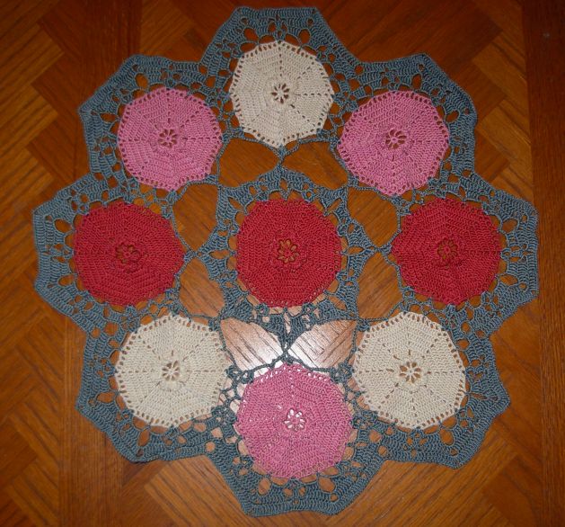 As I write this, the above doily is winging its way to Lisa in Texas, co-owner of a very nice crochet message board I discovered a few months ago, Crochetmania, which features optional swaps as well as just being a nice place for fellow crochet enthusiasts to discuss our crochet passion and just get to know each other. Lisa is making me a purse, which I am looking forward to receiving, in exchange for my making her a large doily. This pattern is called "Blue Danube Centerpiece" and was pictured entirely in blue, but as soon as I saw it, I envisioned it with the round motifs in various colors and the lacy edgings in green to resemble leaves. I used #10 Opera thread in tapestry rose (the dark rose), parasol pink, cream, and sage. I think it measures about 20". I feel it turned out great and I hope she loves it!