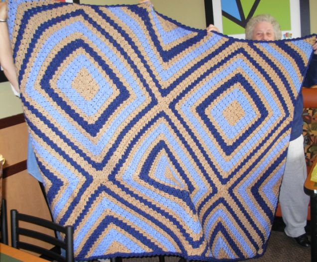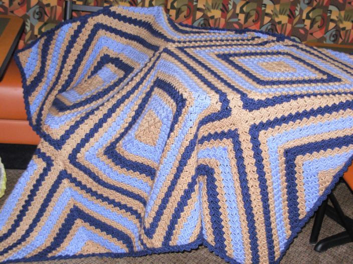 This is the most recent ghan I made for my home. I've wanted to make a ghan in this blue and beige color scheme, even though blue is not one of my main decor colors (except for navy as an accent), as I love the "sand and sea" feeling it conveys. (That's Jean and Clare from Pierce County Crochet holding up the ghan in the second pic.) This ghan consists of 12 17" squares (3 x 4) made in diagonal brick stitch and then assembled in such a way as to form a geometric design. I used what has become my favorite yarn, the smooth and silky Bernat Satin, in Sable (which is not brown but a rich medium beige), the lighter blue is Sapphire and the dark blue is Admiral.