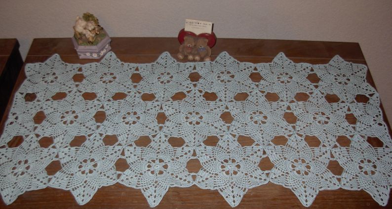 This is a dresserscarf, made with #10 Opera thread in Wintergreen, using the "Midnight Star" join-as-you-go motif. I didn't know when I decided on the size that it would fit this perfectly on my dresser! (I've abandoned the idea of making an entire bedspread using the Galaxy motif pictured on page 2. If I ever do decide to make an entire bedspread, I would be more likely to use this "Midnight Star" motif. It is more relaxing to make and I just prefer the appearance of it.)