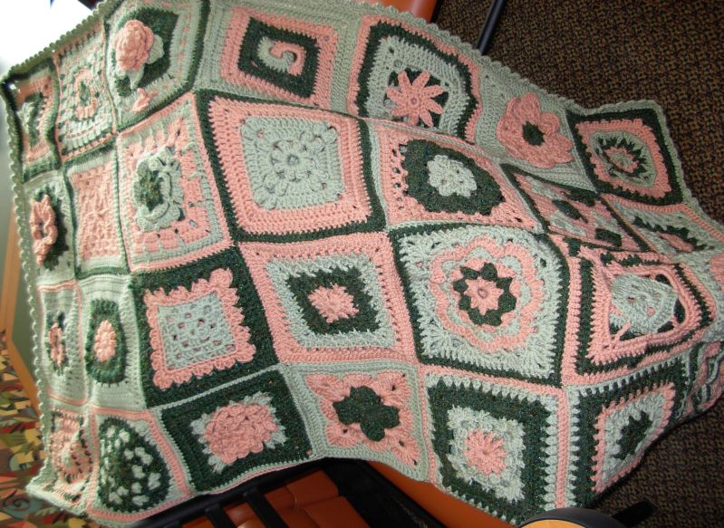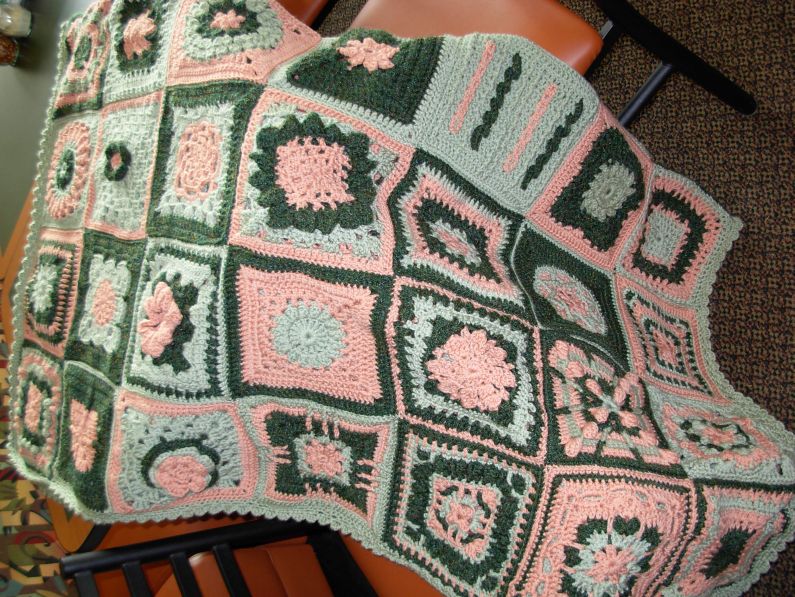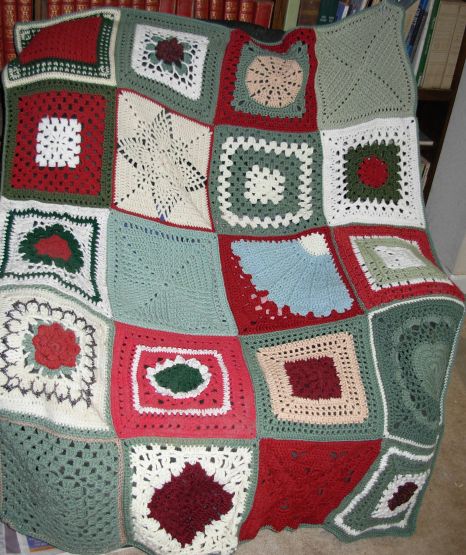 Here is an afghan consisting of 20 12" squares (so the completed size is 48" x 60"). This is a "sampler ghan", a few of the squares having been made by me and the others having been made by various exchange partners from online crochet lists. When I had enough squares to make an afghan, I decided on the order to assemble them and added a simple edging of green half-double crochet.