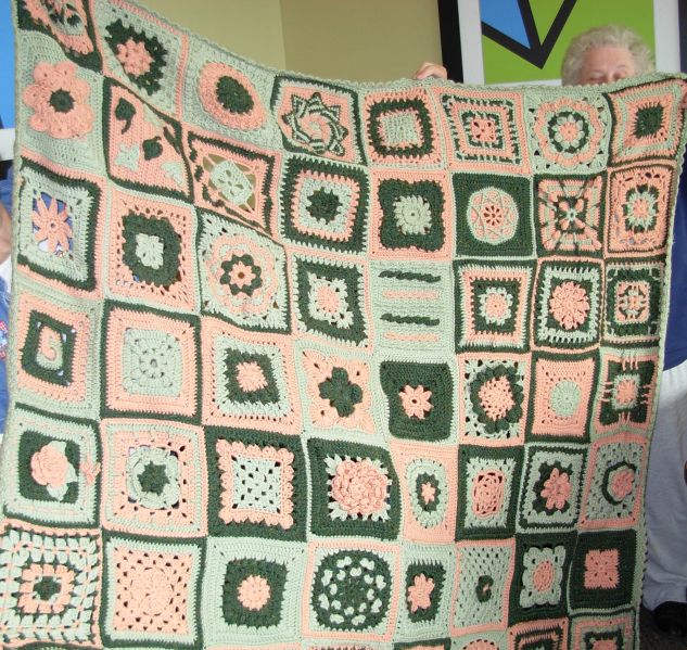 Next is a sampler afghan that is so special that I have posted three pictures of it in an effort to convey its beauty and uniqueness. I hoped to get all 56 squares into the bottom picture (with the help of Jean and Clare from my local crochet group; picture taken May 31, 2008); didn't quite make it but came close! This is my "Friends and Family" ghan which was a joint effort by me, my best friend Dianne, her mom Margaret, her three daughters, and one of her daughter's friends. I made 16 of the 8" squares; Dianne and her family and friends made 6 to 8 squares each. This was a group exchange where we picked out our yarn, gave some to each participant, and we each made 6 to 8 squares for each person's ghan, then we assembled our squares in the order we decided and added the edging. I think mine is the most beautiful ghan ever! The yarns are my beloved discontinued Bernat Berella "Soft Peach", the light green is Bernat Berella "Soft Forest", and the dark green is the beautiful but discontinued Bernat "Mardi Gras".
