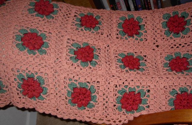 Here's a portion of a large afghan that presently sits on a rocker in the aforementioned room. I love this ghan! The background is Bernat Berella in "Soft Peach", a beautiful color that Bernat (and other yarn companies), for reasons that will always be a mystery to me, don't seem to make any more. The leaves are Bermat Berella in "Soft Forest Green" (which is not forest green but a nice medium seafoam) and the flowers are the rest of the unique one-of-a-kind burgundy multi-toned yarn I'd bought on eBay and which I had used to make the lapghan at the bottom of crochet page 1.