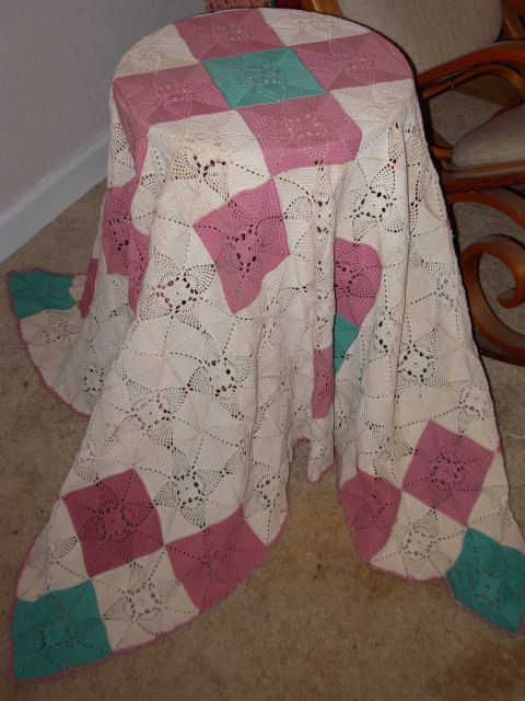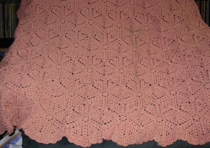 This ghan was made entirely with the Bernat Berella "Soft Peach" and presently sits on a recliner in our great room (sitting/family room). If it looks familiar, it is a larger version of the charity baby afghan pictured on page 2. It is made up of join-as-you-go hexagons and is one of my favorite afghan patterns to make, as well as being elegant-looking.