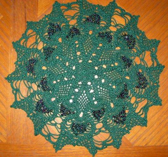 Something else I've been wanting to make for a long time is beaded doilies. Now I've made four this year (2008). I bought a package of very pretty mult-toned beads that have dark blue, purple and green tones in them, as I knew they would look nice on doilies made in any of those colors. The first three doilies I made with these beads is available online ("Shimmering Pineapple Doily"). The one on the left is #10 Opera thread in sage, and the one on the left is #10 Opera thread in hunter. I think I am going to keep these, but am not sure yet where to display them (I may use the hunter one just for Christmas). I also made this same doily with these same beads in a nice medium violet color and used it for a grab bag exchange of our local crochet group. Beverly, the group owner, received and loved it.