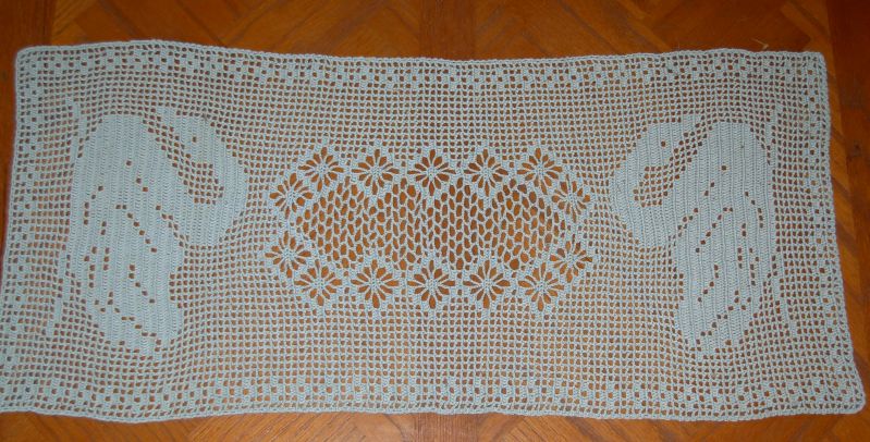 I had wanted to make a filet crochet project for some time. I fell in love with this pattern as soon as I saw it since it also features two other elements I love - swans and a spiderweb design. I decided I was up to the challenge to create this runner for the coffee table in our great room. I used the same #10 Opera thread in Wintergreen as for the dresserscarf above.
