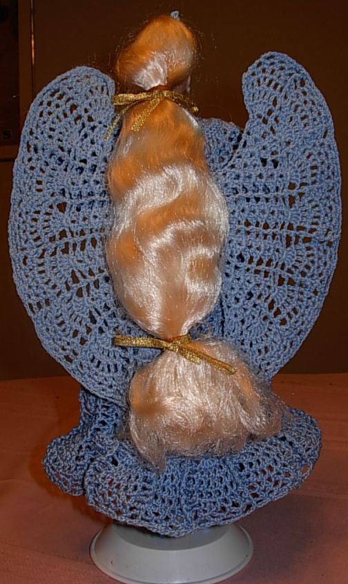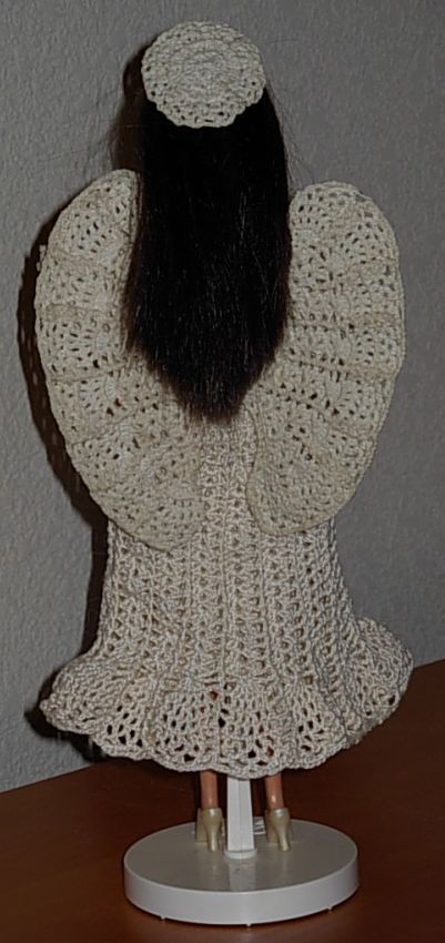 There were 5 angel gowns in the booklet, and this worked out well since I had room, on top of our entertainment center in our "great room", to display exactly 5 in their display cases - and I decided to use #10 0pera in straw (gold). But when I started that 5th pattern from the same booklet, unlike the other 4, I realized I didn't enjoy doing the stitch required and definitely didn't want to make this pattern. What to do? I tried another angel gown from another source but didn't like it either. What to do? Well, I would take stab at finding a Barbie dress pattern that would make a good angel gown, and then I would figure out what to do about her wings and halo. I decided on "Silhouette Dress", which I'd made in the past for craft fairs, and just make the straight part of her skirt a couple inches longer. Beautiful! Now inspired, since she had to have wings and a halo, I did something I honestly never did before in all my years of crocheting. I made up her wings and halo as I went along, using the same stitch as the dress, and comparing to the other angels' wings and halo to get the size right. They came out great, and this angel is my co-favorite along with the blonde "Angel of Joy". In a way, I guess she is my favorite, since her improvised wings and halo make her one of a kind!
