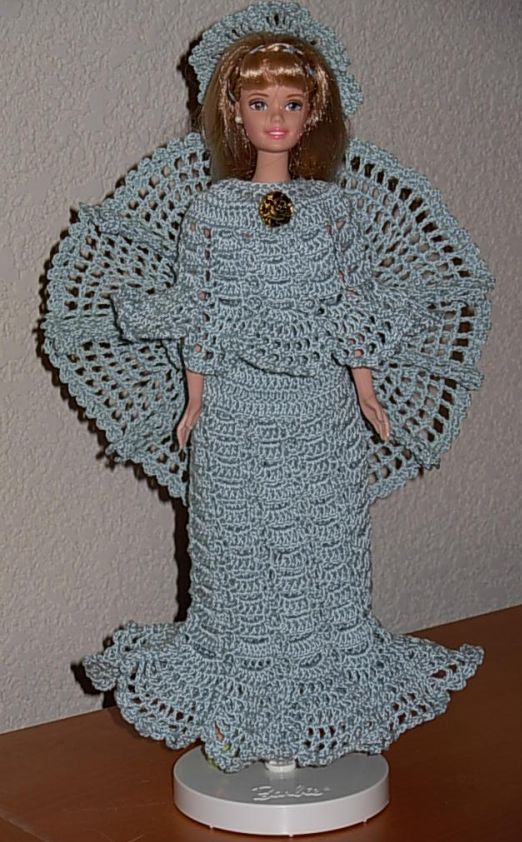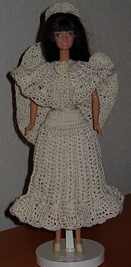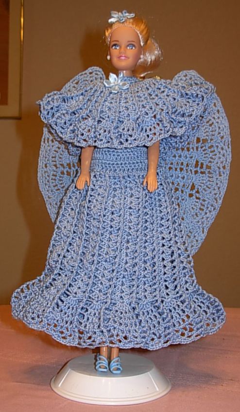 After making these 7 angels, I took a break from Barbie clothes, but have now started again. I've begun a gown for my Asian Barbie in a beautiful variegated rose/purple/blue, and then I hope to begin a wedding party including a magnificent bride, my first Ken outfit for the groom, two bridesmaids and a flower girl. These and more projects will be unveiled, God willing, on the future crochet page 6! But for now, please proceed to page 5!