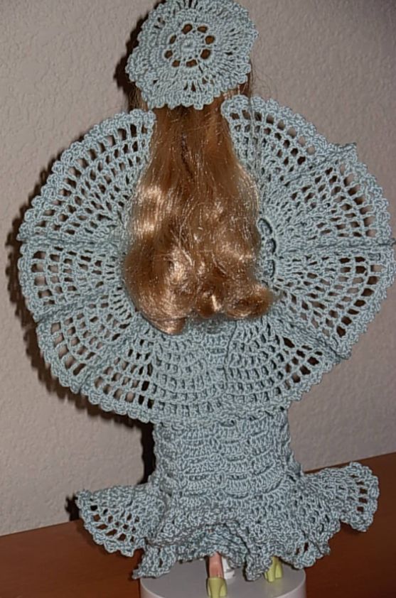 I then decided to try making a Barbie angel from the booklet "Crochet Fashion Doll Angels", designed by Jane Espinoza, and if that went well, that I would crochet a series of Barbie angels in pastel colors (who says angel gowns have to be white?) This one is "Angel of Peace" and I used #10 Opera thread in cream. I realized I would indeed enjoy making and having a series of the angels - and that I would also like to make one for two very special ladies in my life. So......