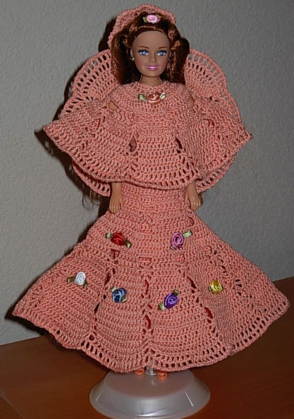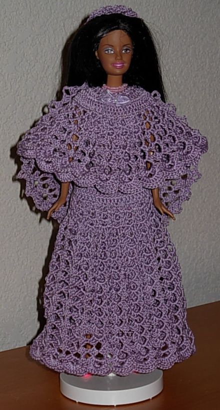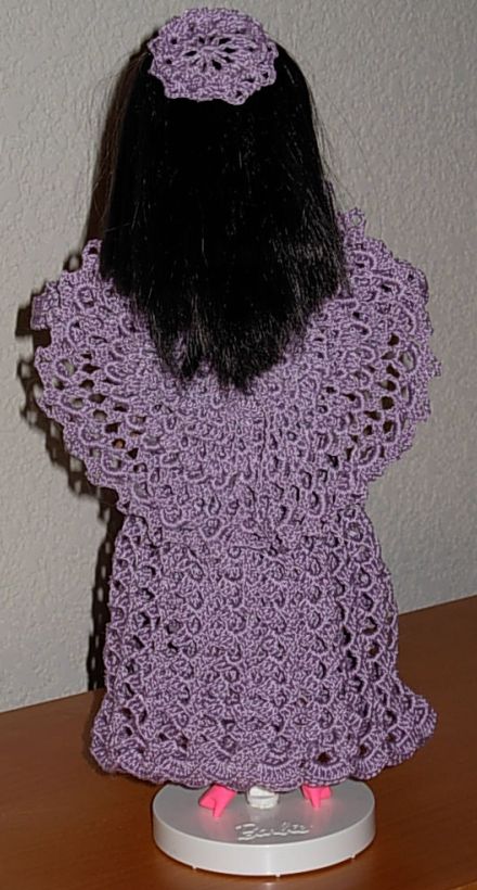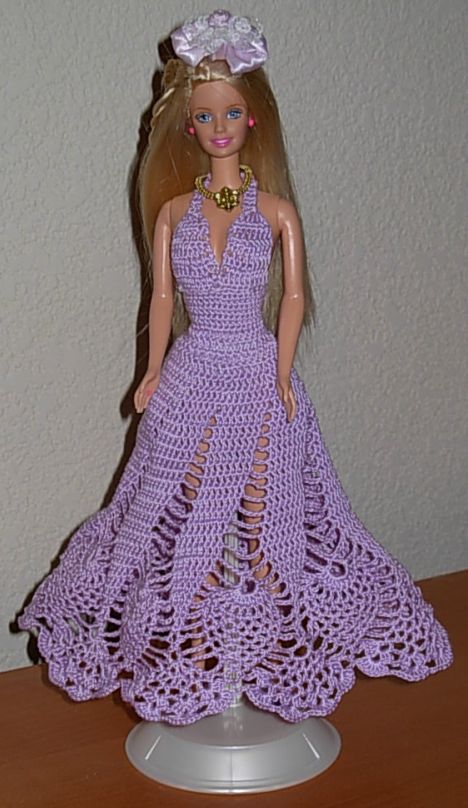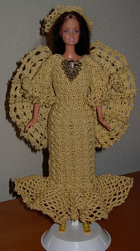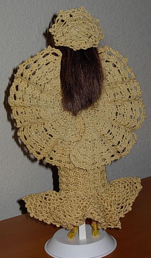 OK, on to the Barbie dresses! It's actually been a couple of years since I made this gown - then I didn't get restarted with dressing more of my Barbies till several months ago. This pattern is called "Pineapple Swirls" and it's available online. I bought her hair ornament (along with the shoes, panties and stands for my present and future completed Barbies) from eBay.