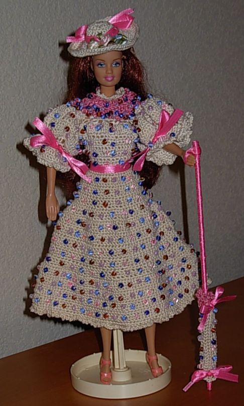 This is the second Barbie I completed. The outfit is called "Dotted Delight" - it's the only beaded Barbie dress I've made so far but won't be the last. Her dress came out a bit short (which I later discovered has to do with hook size and the fact that I crochet tightly) but other than that, I love the way she turned out.
