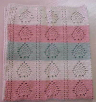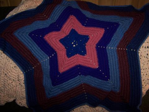 This lapghan, which I sent off to an online group for charity purposes in '06, was made from a versatile pattern called "Beth's Little Star", which is available online (just enter those words into any search engine). I've also used this pattern for dishcloths (nice in patriotic colors) and even doilies; I like the fact that you can make it any size you need to, using any yarn or thread, and it is so easy and relaxing to make.