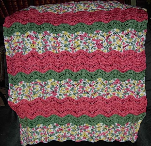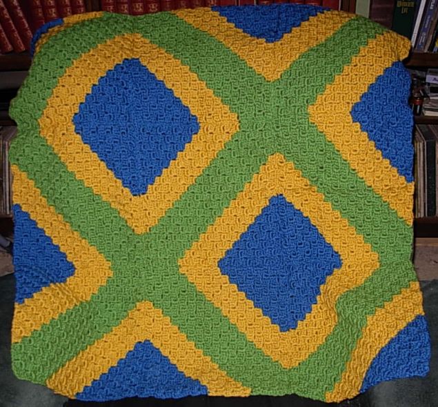I found Vanna's Choice yarn on sale at my local JoAnn's several months ago, and wanting to try it, bought what was left in Sapphire, Mustard and Fern, deciding it would be just enough for a nice lapghan. I decided on the diagonal box stitch (used for my large blue/beige ghan on page 3) since I was able to calculate ahead of time how to arrange the colors to use just the right amount of each, and I love the geometric patterns it forms. I haven't decided yet if this will be a charity item or gift. (And I did like the Vanna's yarn and would like to buy more sometime, after I use some of my current stash! Or not...fellow yarn addicts will relate!)