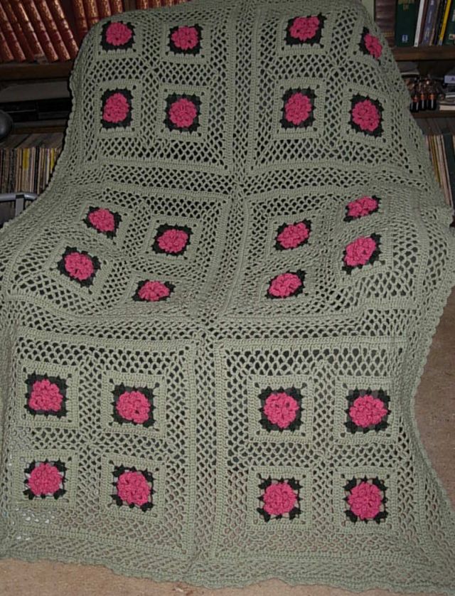 I decided to make a few more ghans for our new home. I'd already made several, but I love ghans! This was the first, called "Irish Roses", done in the join-as-you-go method that I enjoy. I used Bernat Berella in Soft Forest (misnomer; actually a pale dusty green) and Rich Pink, and the leaves are Dark Sage from Red Heart.