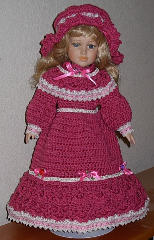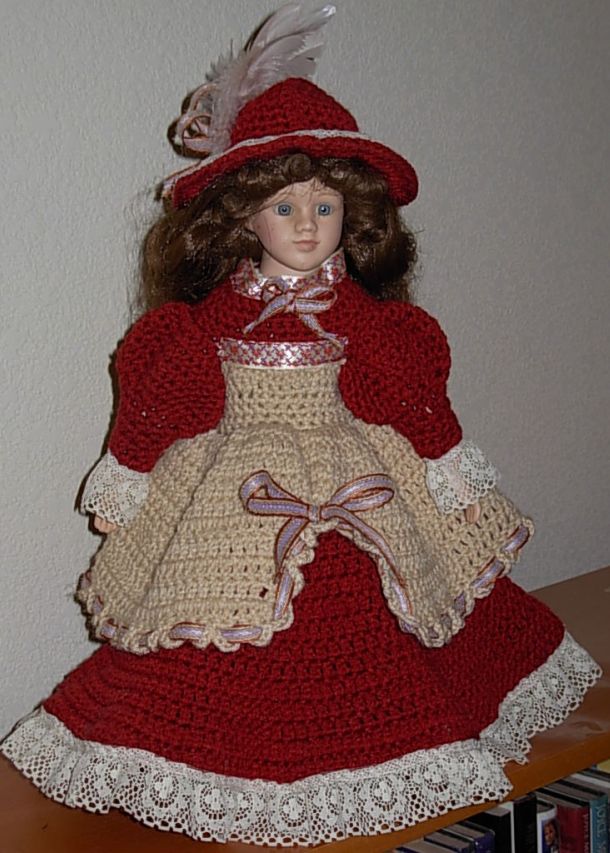 Next, I got started on something I've been wanting to do for a long, long time: create pretty outfits for my few larger dolls. All of the three girl's outfits were designed by Carol Alexander. They were fun to make and then personalize with my own choice of trims. First came Mary Louise, resplendent in Caron "One Pound" in Claret and Bernat Berella in Soft Heather (cream). I've had this lace forever and was so glad to find the perfect use for it! The ribbon and feathers are from JoAnn's.