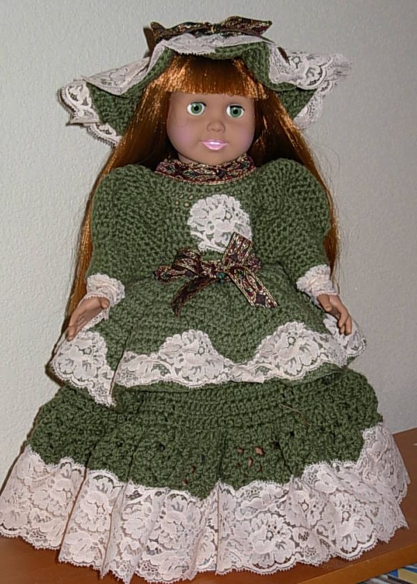 Then I made Melissa this lovely dress in Bernat Berella's Forest Green (really more of a medium sage). She has a similar look to an "American Girl" doll. I found this beautiful wide lace on eBay, and the Medieval-looking metallic ribbon trim is from JoAnn's.