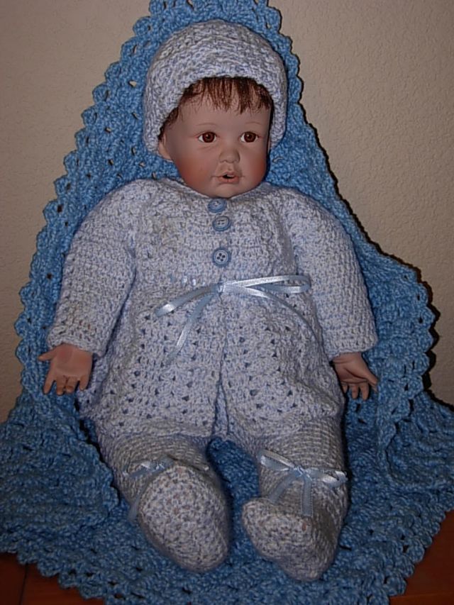 Awwwww!! Don't you just want to pick him up and hug him? This young fellow is an Ashton-Drake collectible doll, "Nicholas, The Winter Baby". He came wearing a white snowsuit and hat, which was cute, but I've wanted to crochet him a pale blue layette for the longest time. The pattern I used is from an Australian booklet and I was thankful that I first read how to make the basic stitches, just in case they were different than the U.S. They were! Their double crochet is our single, their half treble is our half double, their treble is our double, and their double treble is our triple! Keeping these differences in mind, the outfit came out the perfect size and was fun to make! I used Bernat Softee Baby in Blue Denim Ombre. I don't have much experience crocheting baby clothes, but I'm going to use this booklet again (it contains four different layettes) for clothes for real babies. I also crocheted Nicholas a new blankie, since the red plaid one he came with didn't look right with his new springy duds. The blankie he's sitting on is a 20" square in diagonal box stitch, made with Bernat Cottontots in Blue Berry.