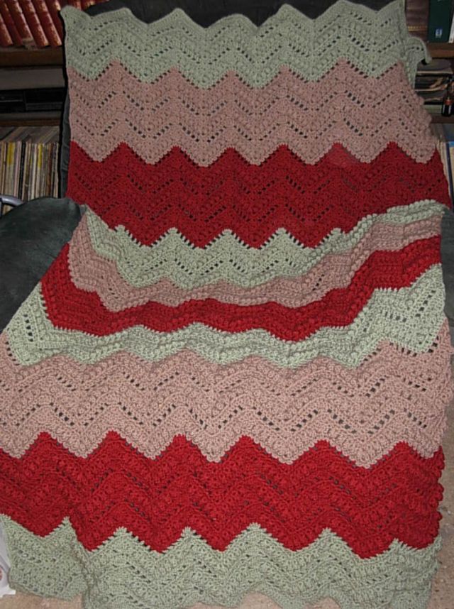 I wanted a ripple ghan but was having some trouble finding a pattern I liked. I decided to make a popcorn ripple, though I knew from having made one for a craft fair years before (which did sell) that they are time-consuming, but I love the look of the popcorn stitches. I used Bernat Berella in Soft Forest and Soft Taupe, and Caron "One Pound" in Claret.