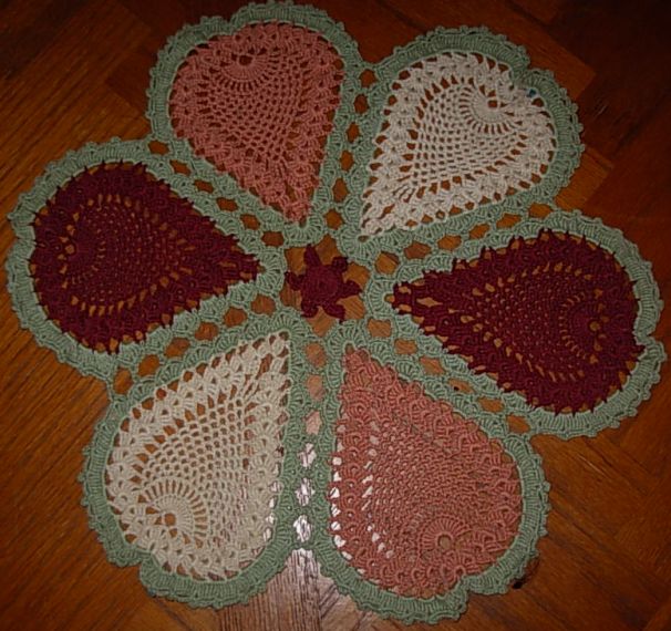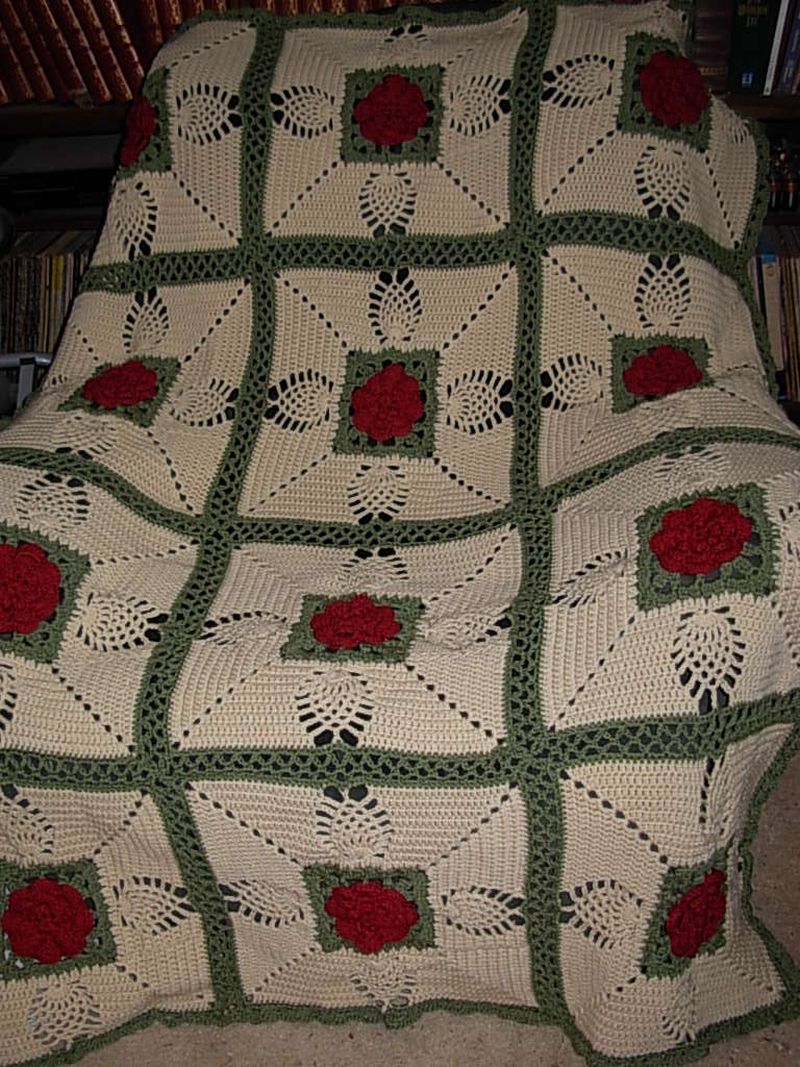 And now, drumroll, please! It's time to show off the large square, and the resulting full-size ghan, that I sort of partially designed!! I realllllly wanted a ghan consisting of large cream squares, each with a burgundy rose in the middle and green leaves. I tried a few patterns but didn't like the way they were turning out. So, wheels again turning, I thought, if I can find a center motif to start with, maybe, just maybe, I can make up the rest. After all, I know how a pineapple is constructed, having made hundreds of them! I was at Dianne's house at the time, and looked through her many crochet patterns. I found a motif by prominent crochet designer Maggie Weldon that I felt would work great. I made it and liked it, but decided for such a large square, it would need a second full row of leaves. I added the cluster stitch leaves and proceeded to create a pineapple on each of the four sides. Then I edged the square in the same green as the leaves and added join-as-you-go loops. The square turned out to be 17", so I would only need 12 for a full-size ghan!