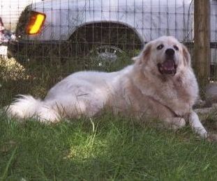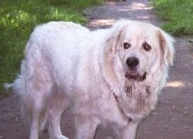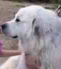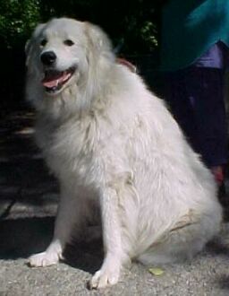 We went from two dogs in '92 to (briefly) five dogs as of April '04 (which went back to four dogs when Tessa died 3 months later). We hadn't been actively seeking a third dog just yet when Gus became available. When we lost him, we hadn't intended to add a fourth dog after Heidi, but it was necessary at the time due to the early problems with Heidi. Four has been a nice round number, and we figured on keeping it there, not planning to add another family member till Tessa went. But God had other plans. I came home from work that Friday night and was told by Rex that he had gone to the feed store earlier in the day to get dog food and saw an ad on their board for a free male Great Pyrenees to a good home. He added that he went to meet the doggie and that he was only 14 months old and very nice. His owners were seeking a new home for him only because they had decided to travel in their RV. I said, "What, another dog, NOW? And another boy?" But he knew I couldn't say no. So he drove a few miles down the road and picked up the boy. He was smallish (to us), only about Gus' size and with a similar soft, wavy coat. He was very sweet but shy; his former family apparently had forbidden him to come inside. So he wouldn't come in the first couple of weeks. He would stand on the second step and look longingly, but go no further no matter how we coaxed. He has since gotten over that!