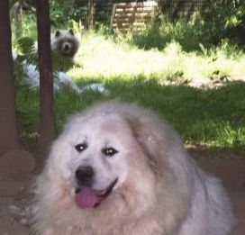 To pick up my tail, I mean tale, of our "furballs", I had left off at the very sad point of our suddenly losing our darling adopted Pyr/Lab, Gus, in the wee small hours of a dark Sunday in January '02, less than 22 months after welcoming him home. We will always love him, and to some it may seem disloyal for us to be getting another dog right away. A new dog could never replace Gus in our hearts. But after being so used to having him inside with us, we NEEDED to have a large furball in close proximity. Rex contacted some rescue people I found online, and was told about a female Great Pyr, Heidi, who was owned by a young couple who couldn't keep her inside with their kids. Shortly after bringing her home, we realized her former owners had not taken the time to properly train her. She had a wild streak that manifested itself in jumping, running through our narrow hall, scratching at doors or walls, and shredding paper or whatever else she could find, 2 or 3 times a day. This behavior would be understandable or sometimes even cute for a 4-month-old pup, but this was a 4-year-old, 105 lb. dog who became obsessed with doing what she wanted, when she wanted. The first several weeks, she could not be left alone with me since I could not control her, so Rex had to take her along in the car when he went to work or the store. Her behavior was especially hard for me to deal with those first couple of weeks, since I had just lost a 3-month temp job with almost no warning three days before Gus died. So I was home alone the rest of January, missing him. I wanted so desperately for Heidi to be my new pal and heal the pain of losing Gus...but it sure wasn't turning out that way. I told Rex several times that we need to change the address on her microchip back to that of her former owners, so that if she ever ran off, it would be "Return to Sender". And I wasn't kidding!