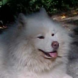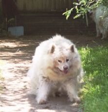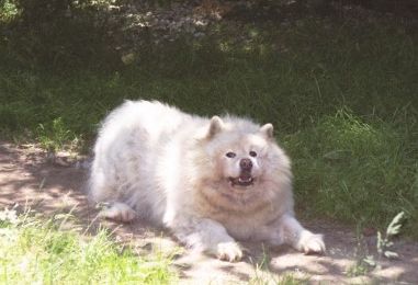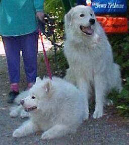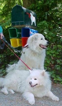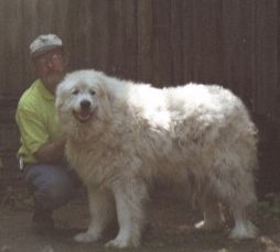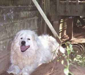 The long, beautiful, white fur of the Great Pyrenees needs to be brushed regularly (at least a couple of times a week) or it easily becomes matted. This became more of a problem with Farley and Tessa when they chose to live outside most of the time. Having come from a family with horses, Gus' coat was in beautiful condition and, since he was an "inside" dog, we were able to keep it that way. Heidi, Colby, Archie, Jesse and Ty likewise came to us with beautiful coats, although Colby was so furry that he got matted easily, and he didn't like to be brushed. Farley and Tessa didn't like to be brushed around their butts and tails where they got the most matted. Regular brushing also keeps them from shedding so profusely, although Pyrs and "Sammies" ARE going to shed a lot no matter what, especially in August! When you have these breeds, you get used to using tape to try to get all the white hair off your black slacks before you go out (and usually not succeeding!). Thankfully, so far, Susie doesn't seem to shed much, though Jesse and Archie more than made up for it! (And so does "Jazz" -- I'm updating this page in August, and I think she has now eclipsed the other dogs' shedding record!)