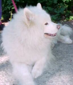 So the search for a cuddly indoor pal for me continued for several more weeks, till the Samoyed rescue lady E-mailed me about a male "Sammy" who was found running loose in the neighboring county, and Rex picked him up the next day, Feb. 26. (After Heidi, I decided I definitely would only consider a boy dog.) He brought Heidi to make sure they would get along. Thankfully, she was nice to him since that first meeting, and strangely enough, he seemed to think she was his sister. (In fact, he wouldn't go for long walks with just me - he'd keep turning around and looking for Rex walking Heidi and if he doesn't see them, he'd do his business and come back! Didn't get much exercise with this dog!) I named him Colby but I called him "bedroom boy", since he often slept on our bedroom floor due to his separation anxiety; he would bark if he realized he was in a room alone. He was very well-behaved for the most part except for sometimes getting excessively barky, and was very lovable. He was only 66 lbs. when we adopted him but ballooned in the next couple years to over 100 lbs.; very unusual for a Samoyed. When he had been found by the shelter, he was with another Samoyed assumed to be his brother, and the brother was adopted first. So I imagine that led at least partly to his separation anxiety. He also had the strange quirk of wanting to eat paper towels, so we had to be very careful to not leave any lay around. We also discovered he even ate one of my stockings on a couple of occasions, when it came out in his poop! This led us to jokingly call him our "goat".