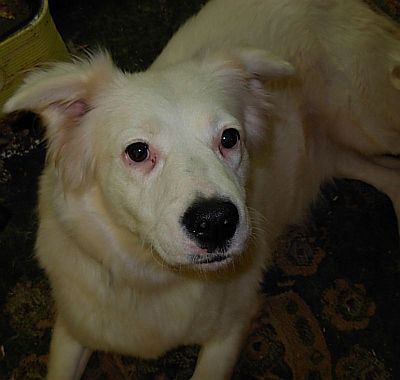 The newest canine member of our family joined us on December 9, 2009 -- which, ironically, would have been our Heidi's 12th birthday. When we unexpectedly lost Heidi, I knew I wanted another cuddly girl, and soon. I wanted the new girl to be young, but not a pup we'd have to housebreak, and I wanted her ulimate full grown size to be manageable enough to walk (which I couldn't do with Heidi). We'd had success finding Archie on Petfinder.com, so I spent time there looking for dogs that were at least part Great Pyrenees (which I knew Rex would want). I found a year-old girl Pyr in the Yakima area who I thought we were supposed to have. But it was between paychecks and we wouldn't have the adoption fee for over a week -- if then, since it would also be tricky to get to that area in Dec., depending on the weather. That shelter wouldn't hold that girl for us. But there was another girl who'd caught my eye and was closer by, in the Olympia area. She was said to be a Great Pyrenees/Border Collie mix, and had been rescued from a home where someone was hoarding animals and she wasn't getting enough care and attention. I liked her description and her "smile" in the pic, so I completed and returned the app to the shelter. Other people had also applied to adopt Susie, but the lady at the shelter and the lady at the foster home both liked our app best. So they agreed to wait over a week till we had the adoption fee.
